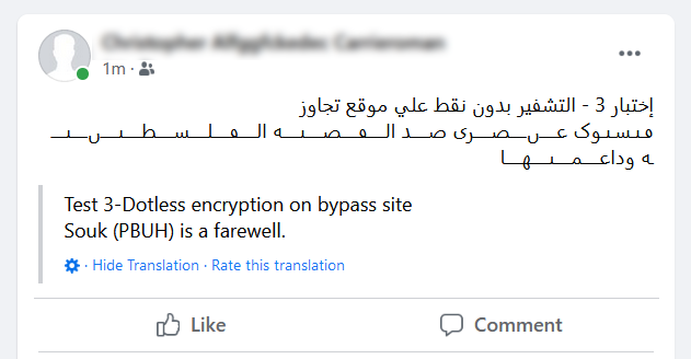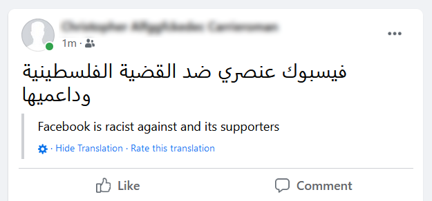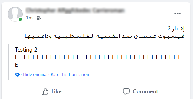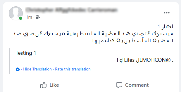 الصور التالية توضح كيفية تعامل الخوارزمية الخاصة بـ فيسبوك مع المنشورات وترجمتها لـ اللغة الإنجليزية لمعرفة كيف يقوم فيسبوك بقراءة النص